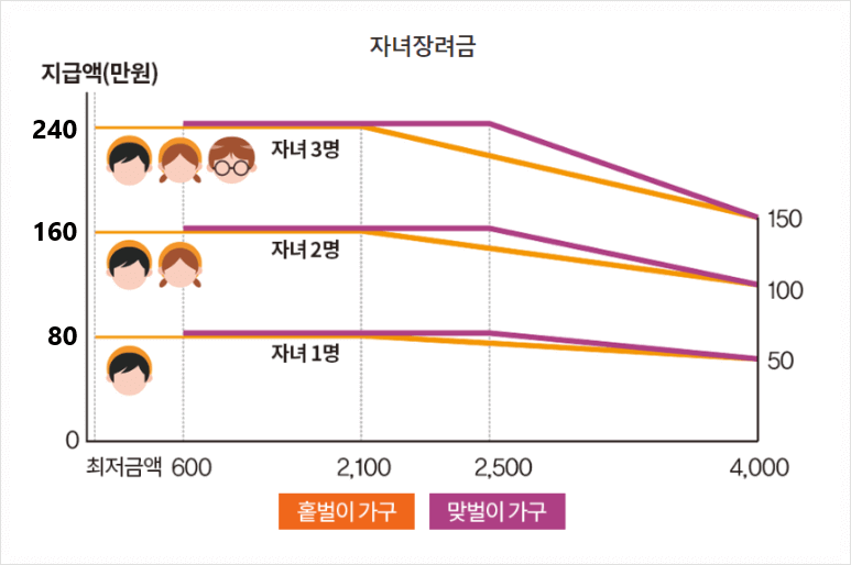 맞벌이 가구 600만 원 이상 ~ 4,000만 원 미만 자녀 1인 당 50만 ~ 80만 원