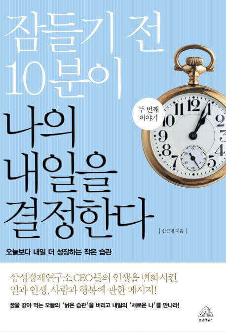 이 책은 2005년에 나왔던 잠들기 전 10분이 나의 내일을 결정한다의 두 번째 책입니다. 전편에서는 잠자기 전 10분을 활용해 하루동안의 수고스러움을 덜면서 회복하는 방법을 얘기했다면, 후속편인 이 책에서는 잠들기 전 10분을 활용해 습관의 변화를 가져오는 방법들에 대한 내용을 다룹니다. 이 책은 총 여섯 개의 챕터로 구성되어 있습니다. 첫번째 챕터에서는 주도적 시간 지배의 중요성과 잠들기 전 10분의 의미를 알 수 있게 해 주고, 더불어 나를 알게 해 주며, 성공의 문을 열기 위해 관점을 바꿀 수 있도록 안내합니다. 두 번째 챕터에서는 상대방의 마음을 여는 기술을 통해 인맥관리를 하면서 사람을 얻는 것의 중요성을 얘기해 주고, 세부적으로 배려와 헤아림, 말의 조심, 설득의 달인 기술 그리고 나를 매력적으로 만드는 것에 대해서 설명해 줍니다. 세 번째 챕터에서는 고난과 위기가 닥쳐왔을 때 돌파할 수 있는 에너지를 내는 방법을 알려주고, 고난은 축복이 될 수 있다는 것, 실패는 영원한 실패가 아니라는 것, 세상엔 공짜가 없다는 얘기와 함께 생각의 전환을 도와줍니다. 네 번째 챕터에서는 잠깐동안의 성장이 아닌 지속가능한 성장을 할 수 있도록 프로가 되는 방법을 알려줍니다. 다섯 번째 챕터에서는 현재의 안주가 위기를 불러오기에 생존에 안위하지 않고 더 많이 성장하는 방법을 알려줍니다. 여섯 번째 챕터에서는 매일매일 다가오는 변화를 읽고 세상을 읽는 법에 대해서 알려줍니다. 책 끝부분에는 삼성경제연구소(SERI, 현 삼성글로벌리서치)에서 추천하는 CEO들의 필독서를 제시함으로써 독자에게 추가적인 도움을 주고 있습니다.